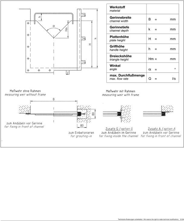 Meßwehrtafeln aus Edelstahlblech, mit dreieckigem Ausschnitt, mit Handgriff. Rahmen zum Einstecken der Meßwehrtafel, aus Sonderprofil, mit Mauerankern zum Einbetonieren in Gerinne, mit beidseitiger, austauschbarer, abwasserbeständiger Gummidichtung.